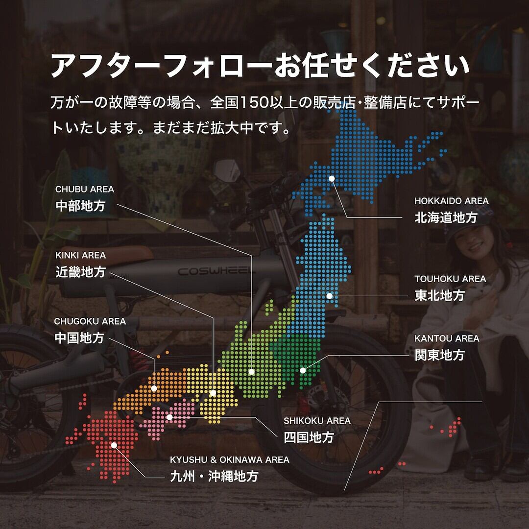 もしもの場合は全国に提携サービス店がございます。アフターフォローの対応をおこなう販売店や修理店は全国に150店舗以上、まだまだ拡大中です。製品についてお困りごとがございましたら、まずは下記のサービスセンターまでお問い合わせ下さい。1〜2営業日以内にご返信いたします。