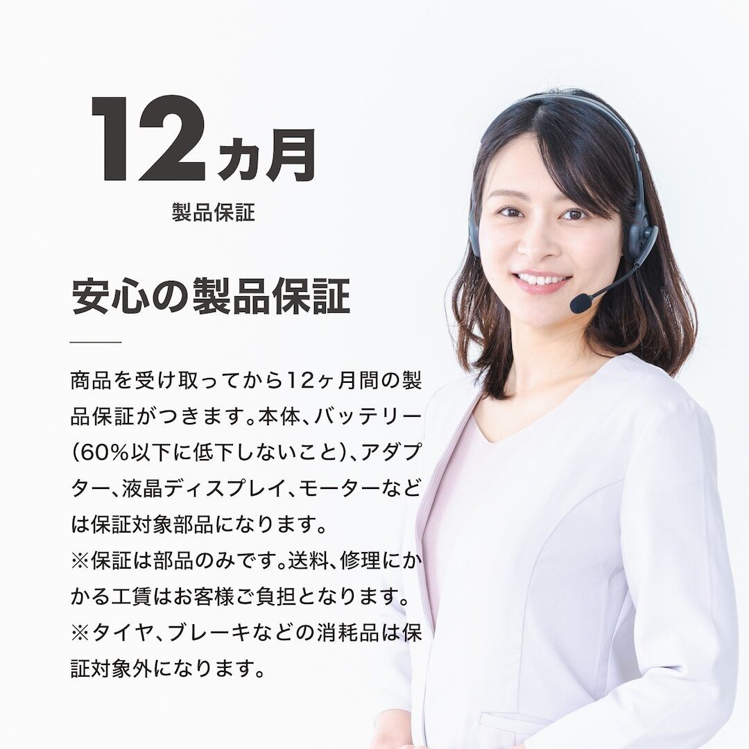 商品を受け取ってから12ヵ月の製品保証がつきます。タイヤ、チューブ、ペダル、ブレーキなどの消耗品は保証対象外になります。本体、バッテリー(60%以下に低下しないこと)、アダプター、液晶ディスプレイ、モーター、ハンドル、ナンバー灯などは保証対象部品になります。万が一の故障の際、外装部品はすべて着脱可能で90%の部品はお客様自身でも簡単に交換が可能です。